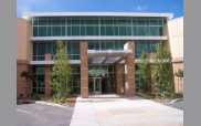 Santa Clarita, CA 2-story concrete tilt-up office building with glazed rotunda at street intersection.
